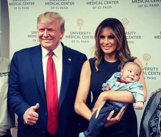 وتظهر الصورة ترامب وهو يبتسم وكأن ابتسامته تعكس لا مبالاة بمصيبة الرضيع، بينما حملت زوجته، ميلانيا، الرضيع وابتسمت بدورها.