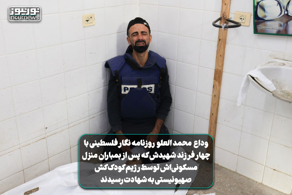 وداع «محمد العلو» روزنامهنگار فلسطینی با چهار فرزند شهیدش که پس از بمباران منزل مسکونیاش توسطرژیم کودککش صهیونیستی به شهادت رسیدند.