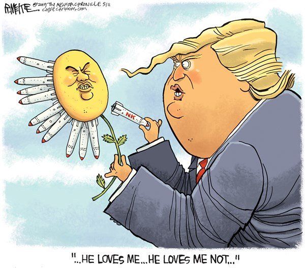ترامپ پس از چند دیدار با رئیس جمهور کره شمالی گفته بود «من و کیم عاشق یکدیگر شدهایم». اما نتیجه ندادن این دیدارها و تصمیم کیم جونگ اون برای ایجاد ارتباط با روسیه و انجام آزمایشهای موشکی، سوژه کارتونی از ریک مککی کارتونیست آمریکایی در سایت کگل شد.