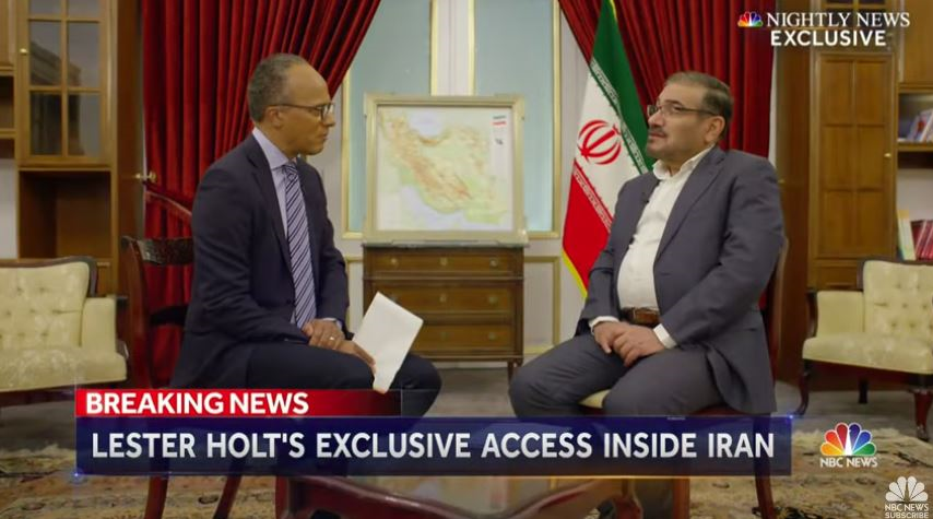 این شبکه آمریکایی سپس به سراغ «علی شمخانی» دبیر شورای عالی امنیت ملی جمهوری اسلامی ایران رفت و با او به مصاحبه نشست. لازم به ذکر است متن پیاده شده از صحبتهای شمخانی بر مبنای ترجمه انگلیسی است که شبکه ان.بی.سی روی گزارش خود صداگذاری کرده است.