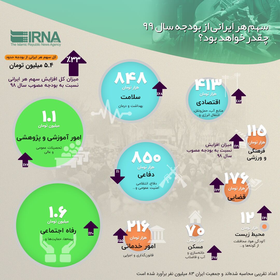 سهم هر ایرانی از بودجه 99 چقدر است؟ دولت برای هر شهروند ایرانی در هر یک از حوزههای دفاعی، اقتصادی، آموزشی و...چقدر بودجه در نظر گرفته است؟