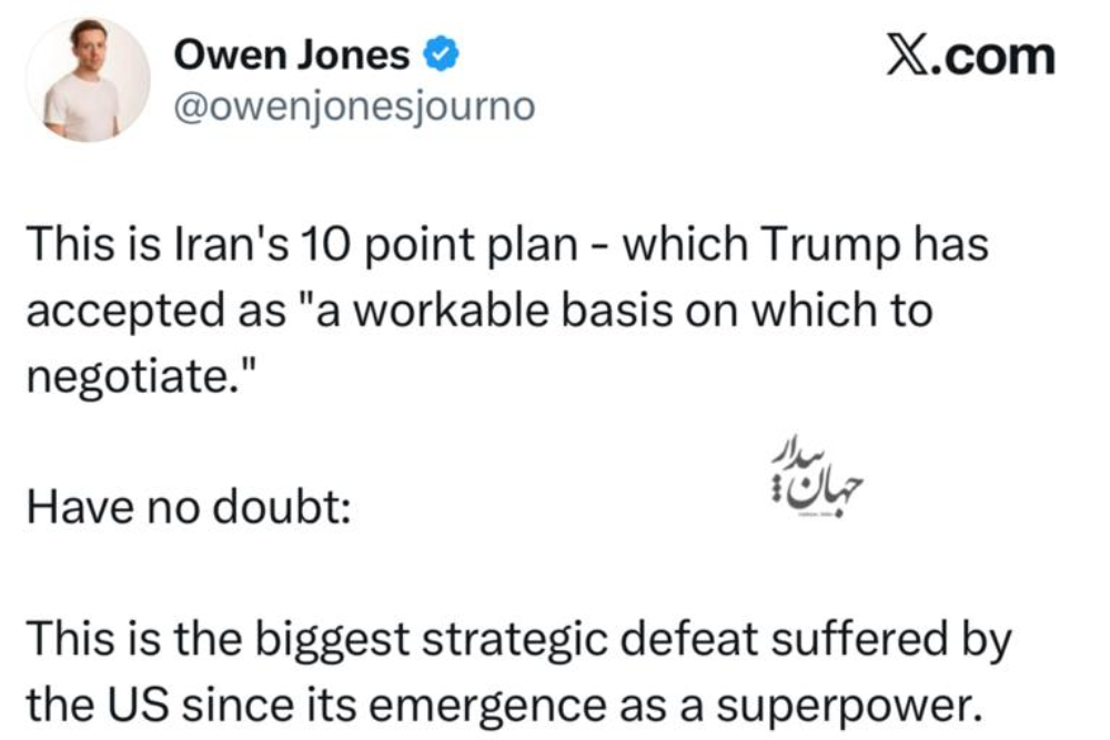 «اوون جونز» روزنامهنگار معروف انگلیسی گفت: این طرحِ 10 مادهای ایران است که ترامپ آن را به عنوان «مبنایی عملی برای مذاکره» پذیرفته است. ذرهای شک نکنید: این بزرگترین شکست استراتژیک آمریکا از زمان ظهورش به عنوان یک ابرقدرت است.