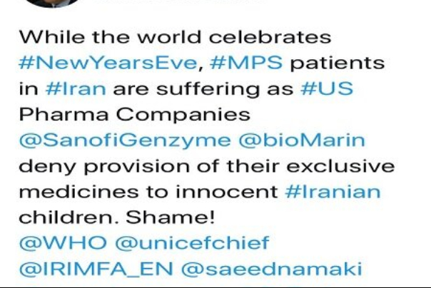 به گزارش نورنیوز، دکتر اسدی لاری در این باره در حساب توییتری خود نوشت: در حالی که جهان سال نو میلادی را جشن می گیرد، بیماران MPS در ایران به دلیل امتناع دو شرکت داروسازی امریکا از ارائه محصولات انحصاری خود به کودکان بیگناه ایرانی، از بیماری به شدت رنج می برند.